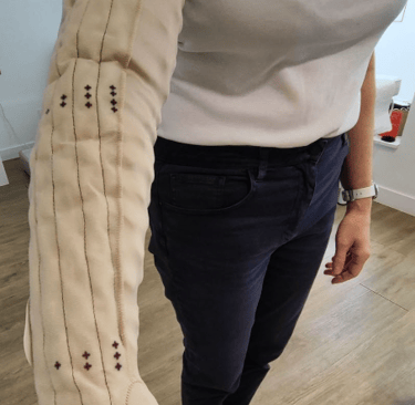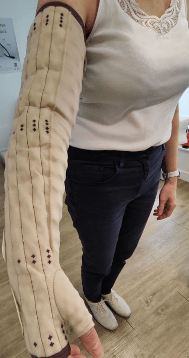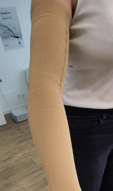 2. La phase de maintien : c’est là que j’interviens. Je prends des mesures pour faire un manchon compressif sur mesure, parfois avec un système spécial comme le Mobiderm (des petits coussinets qui stimulent le drainage).