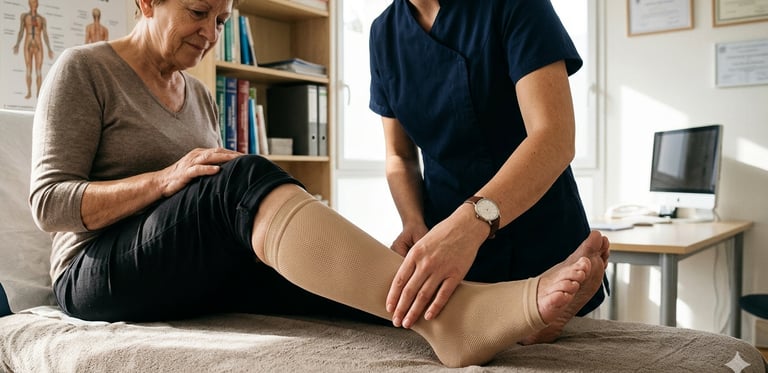 Aujourd’hui, nous sommes loin des clichés sur les "bas de contention" peu esthétiques. Nous utilisons des dispositifs de compression médicale de haute technicité, qui sont les piliers du traitement physique.